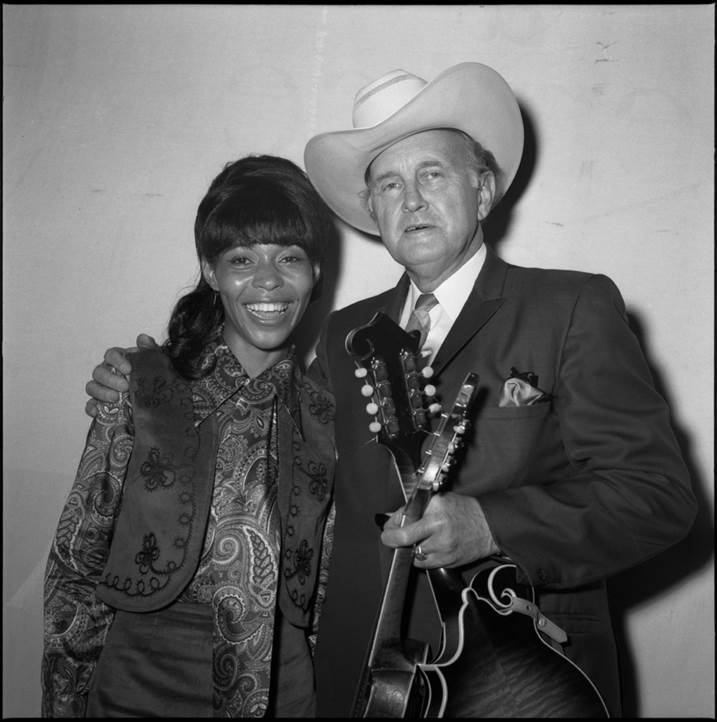 Figure 18. Linda Martell poses next to Bill Monroe before performing on the Grand Ole Opry. (Photographer Unknown, Linda Martell and Bill Monroe backstage at the Ryman Auditorium, August 1969, Black and White Negative, 5.67 x 5.71 cm, Digital Collection, Country Music Hall of Fame and Museum, Nashville, Tennessee, https://digi.countrymusichalloffame.org/digital /collection/photo/id/60392/rec/6)
