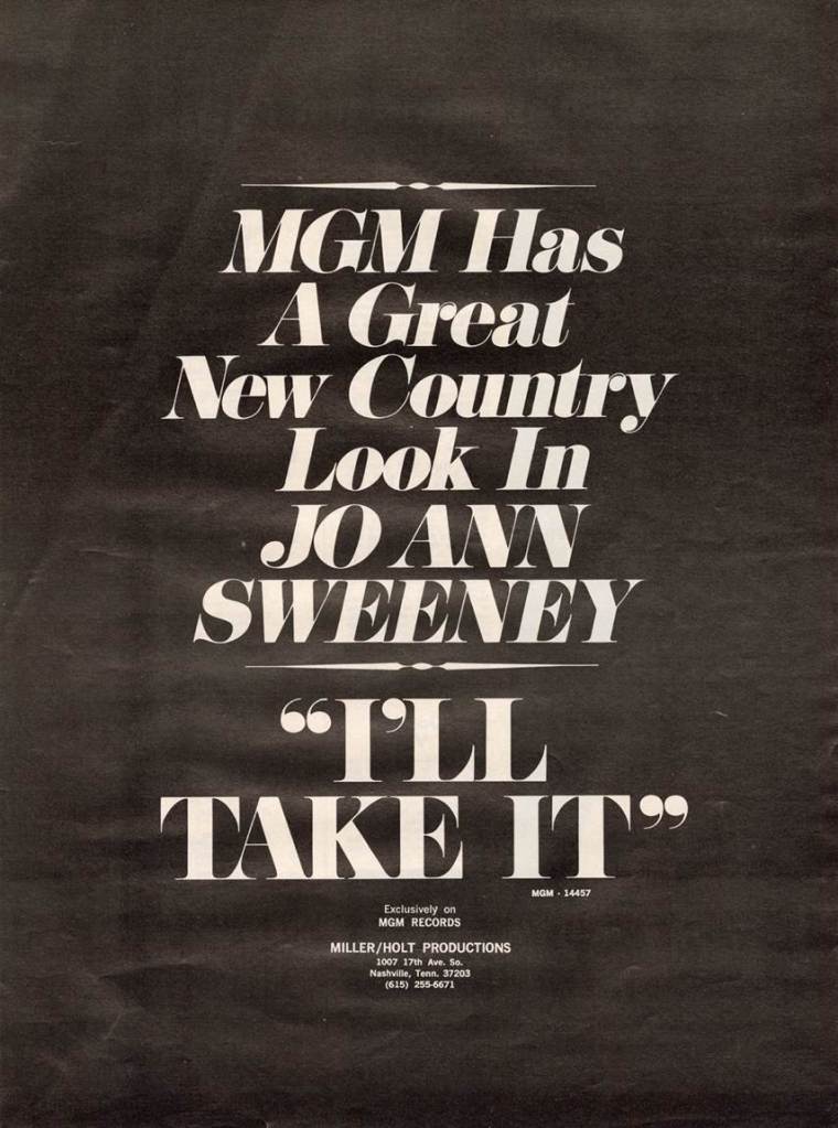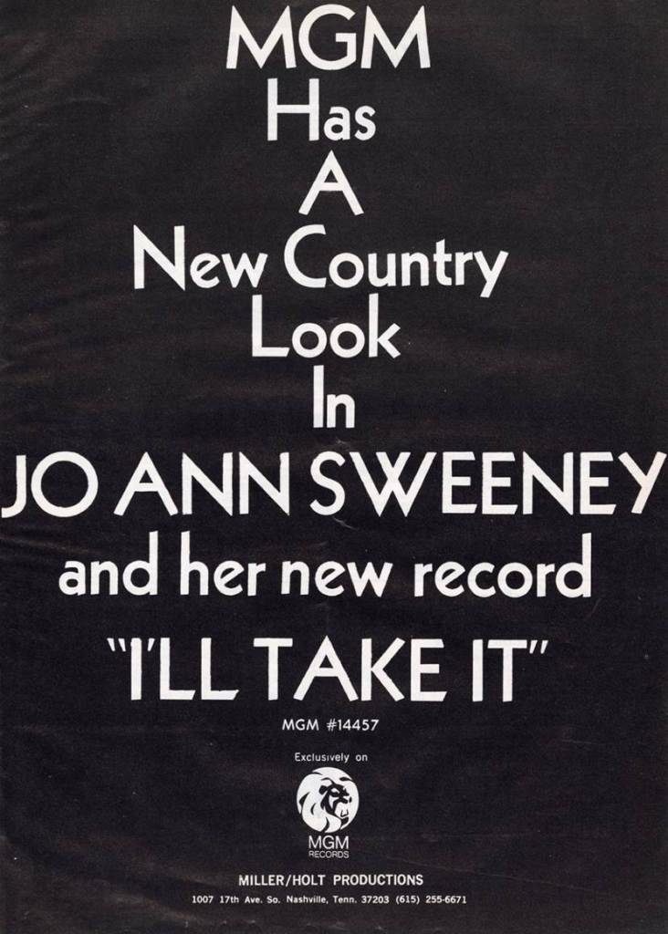Figure 22. Advertisement published in Billboard magazine promoting Eugenia JoAnn Sweeney’s single “I’ll Take It.” (“MGM Has A New Country Look In Jo Ann Sweeney,” Billboard, November 1972.)