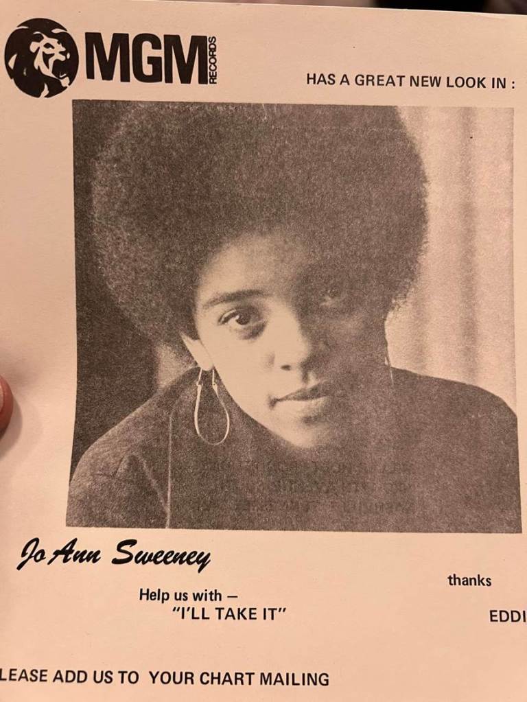 Figure 23. Advertisement published in Cashbox magazine promoting Eugenia JoAnn Sweeney’s single “I’ll Take It.” (“MGM Has A New Look In Jo Ann Sweeney and her new record,” Cashbox, December 1972.)
