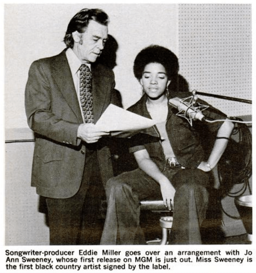 In 1972, Eddie Miller joined other music producers in “expressly seeking Black women who might become the female complement to Charley Pride,” and who could take the place of Linda Martell. Miller was a well-established singer-songwriter who had recently relocated to Nashville from Southern California in 1967. [2] Miller was known primarily for the commercial success of “Release Me (And Let Me Love Again),” a song that he helped pen in 1949 that quickly grew in popularity – a song that is now considered “an all-time country standard.”[3] His commercial success and notoriety on Music Row led him to establish Miller-Holt Productions where he represented other artists and continued to write songs. In 1972, he began representing Eugenia JoAnn Sweeney; however, accounts of how Ms. Sweeney’s career started and how she initially met Eddie Miller all differ slightly.[4]