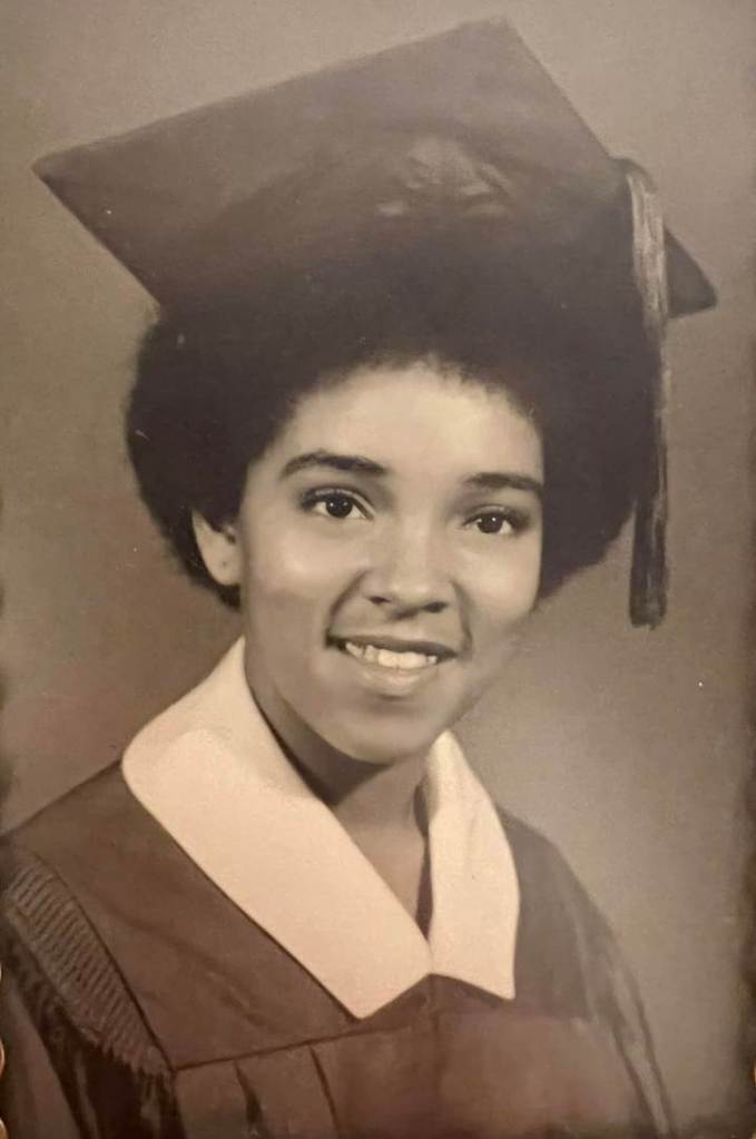 Figure 17. Eugenia JoAnn Sweeney posing in her cap and gown ahead of graduation from Pearl High School. (Michael Kevin Neal, Personal photograph, “Eugenia JoAnn Sweeney high school graduation portrait,” 1972.)