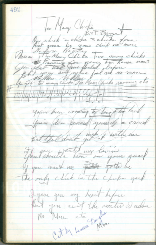 In 1962, Leona Douglas recorded two tracks and released them on a single 45. The record’s A-side track was “Too Many Chicks” which later “became a hit.”[1] “Too Many Chicks” was written by acclaimed songwriting duo Boudleaux and Felice Bryant who “are widely considered to be the first to move to [Nashville] in order to make a living solely as songwriters.”[2] The song’s handwritten manuscript is now a part of the Country Music Hall of Fame and Museum’s archives (Figure 8). Prior to 1962, the duo had written many hits for other artists including “Country Boy” recorded by Little Jimmy Dickens in 1949 and “Wake Up, Little Susie” recorded by the Everly Brothers in 1957.[3]