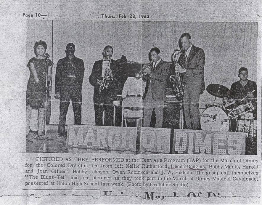 In February of 1963, Leona Douglas walked onto the stage at Union High School to perform in the Teenage Program in support of the March of Dimes. Ms. Douglas grabbed the microphone stand in front of her as a photographer snapped an image that was later published in a local newspaper (Figure 9). Performing as a member of a group called The Blues-Tet, this moment marked one of her earliest performances as a R&B artist, transitioning away from country and western music. Soon after, Leona Douglas joined Southern City Records, a record label founded by Ms. Douglas’ longtime manager, Harold Gilbert, and his wife, Jean Gilbert.[1] Returning to Gallatin, Tennessee, Ms. Douglas was represented by Harold and Jean Gilbert’s adjoining agency Hittsburgh Music Company. [2]